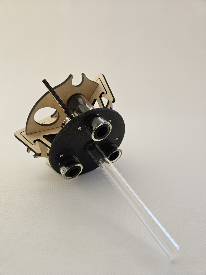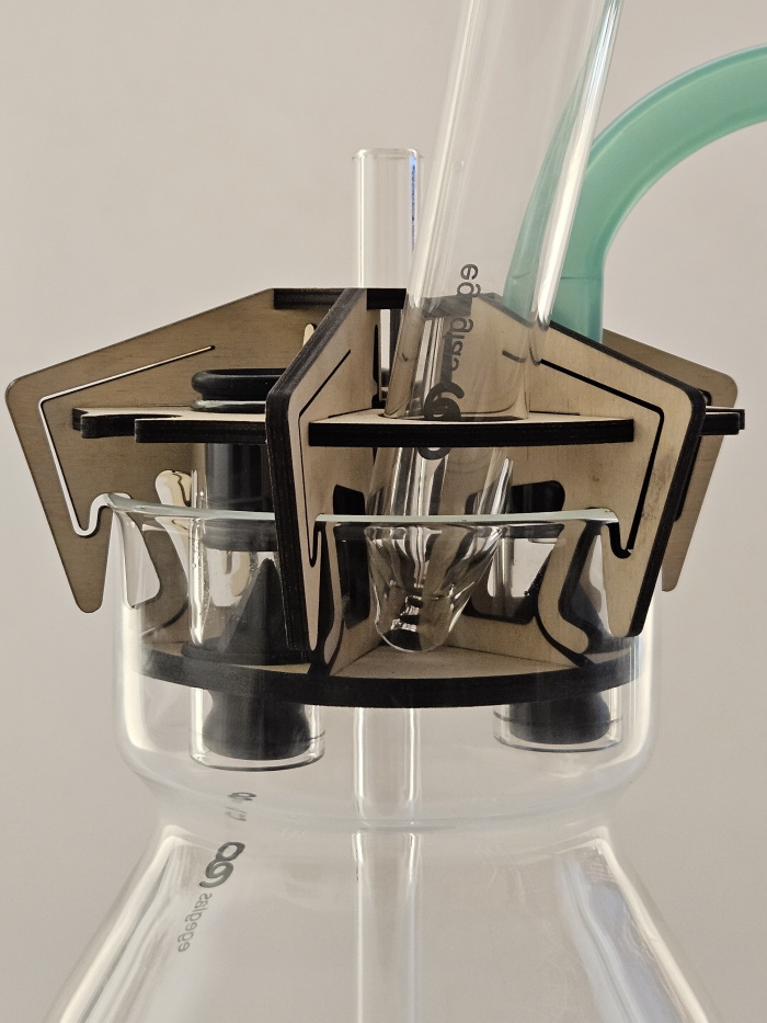 - Teller, Vase, Tauchrohr und Schlauchanschlüsse aus Borosilikatglas. Dieses Glas wird z.B. auch für Backformen und Chemielaborgeräte verwendet.
