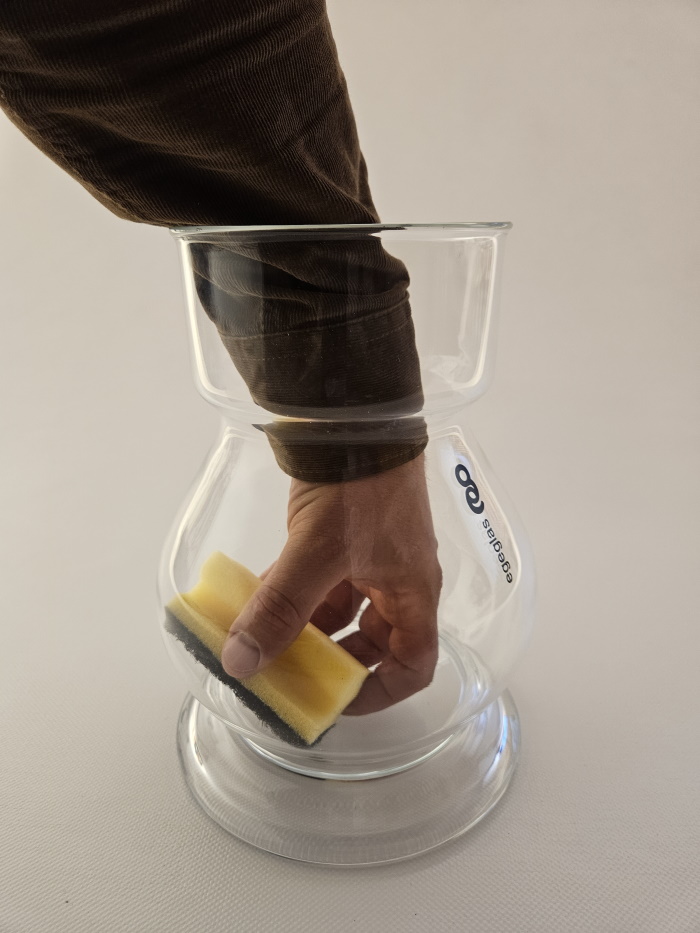 - Kopfanschluss, Schlauchanschlüsse und Klappenventile aus lebensmittelechtem Silikon. Das selbe Material, aus dem auch egeglas Schläuche gemacht sind. Geschmacks- und geruchsneutral, hitzebeständig bis 250° C.